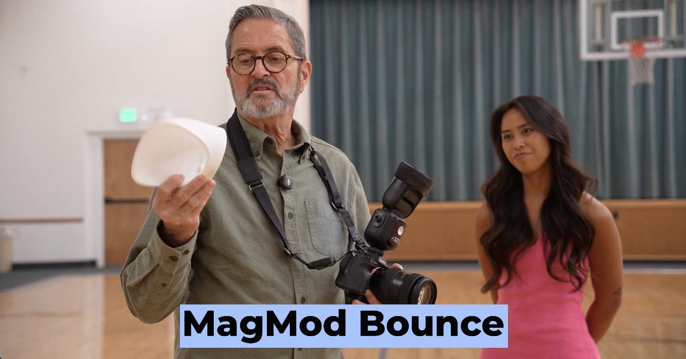 The next modifier we’re going to use is a MagMod Bounce. Now, this is set up with a neoprene ring that you put on your flash and it has a magnet in it. So, this will just pop right on the magnet. So, that makes this very easy to come off and on. So, it’s easy to take this.