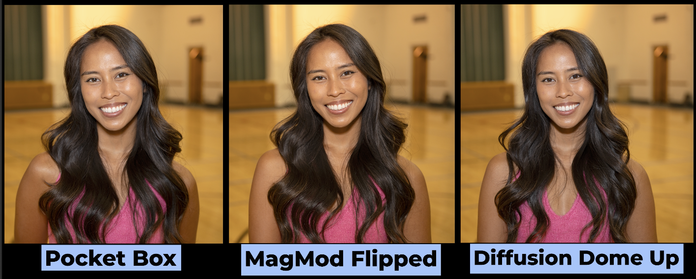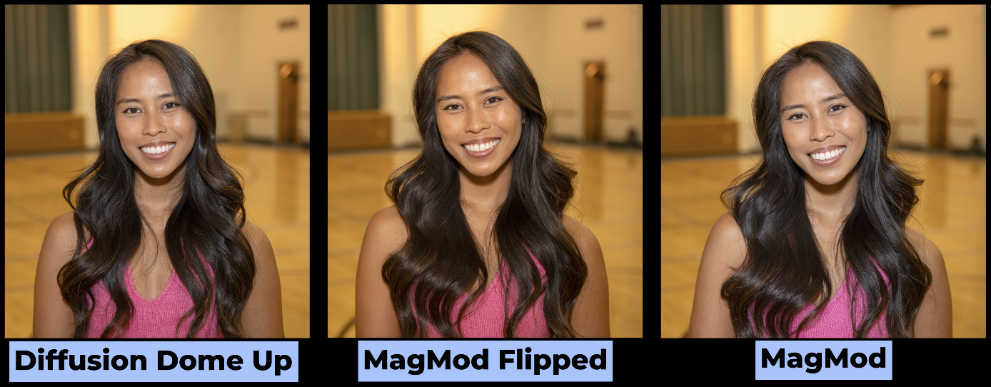 So, here’s a Diffusion Dome when I aim this strobe straight up compared to that MagMod diffuser when I turn it around backwards and when I shoot straight through it. Which one of those do you like?