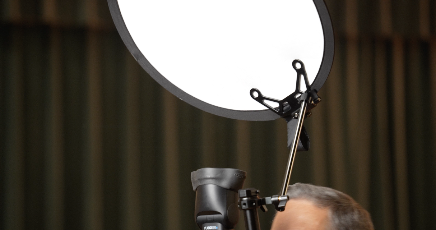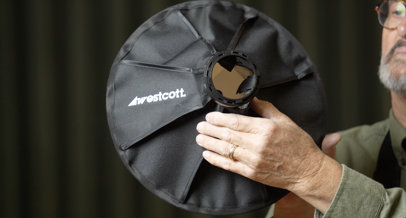 Our next modifier is an FJ80 Pocket Box from Westcott. It’s a small little circular box. It’s got a Bowen’s mount, so it’s going to go straight onto our Bowen’s mount ring there.