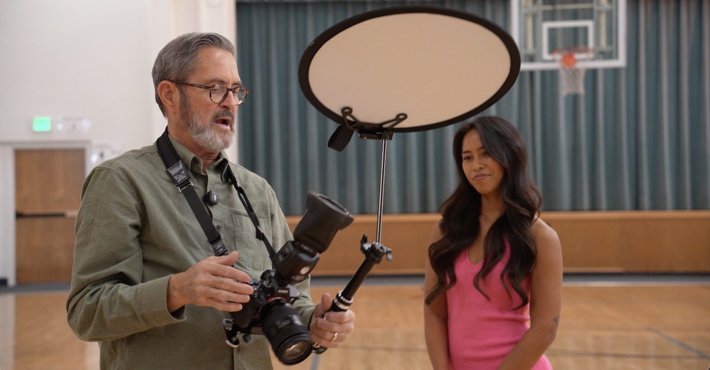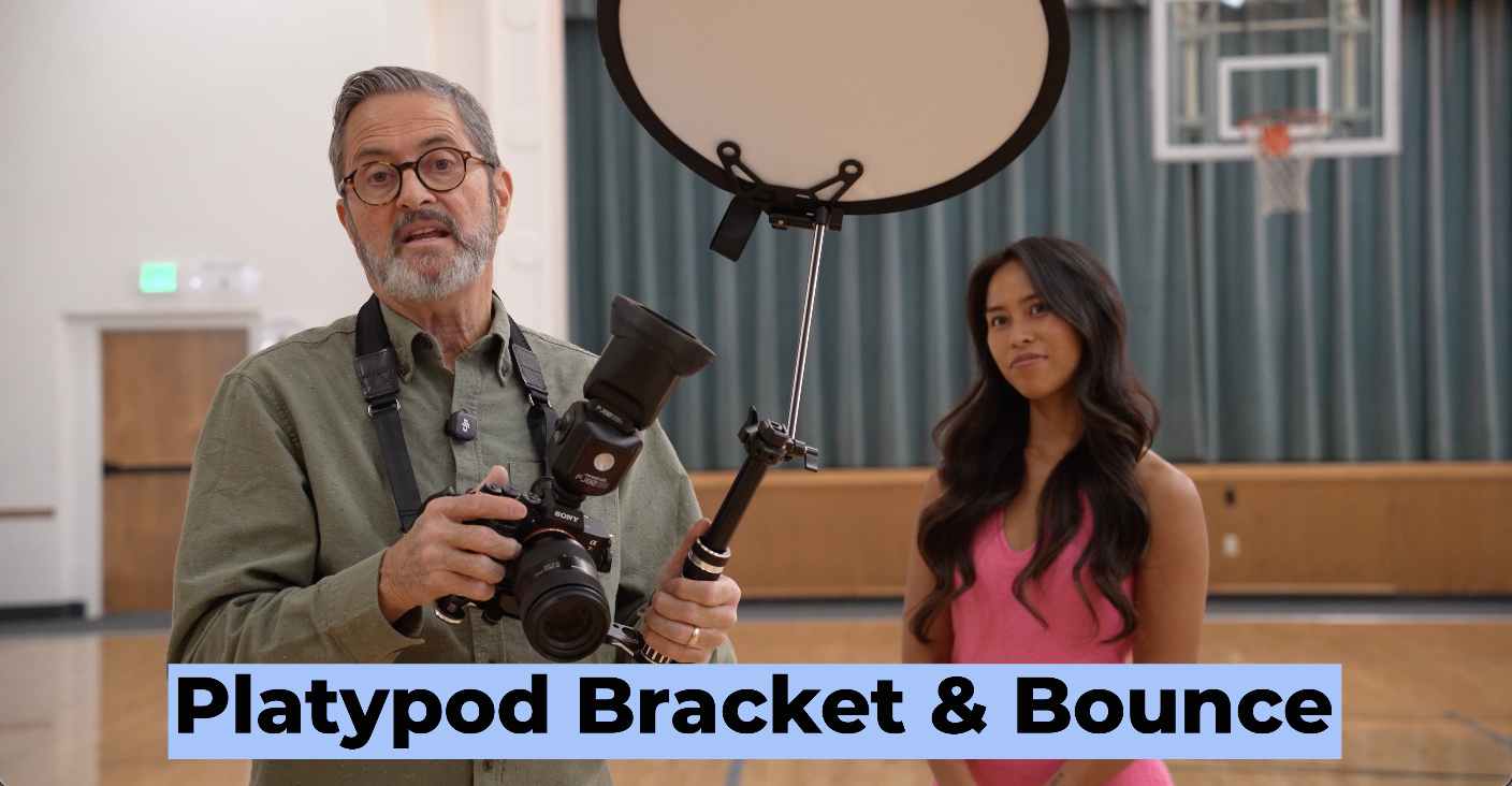 So, our next modifier is actually a Kickstarter that’s out right now from Platypod. It’s called the Platypod Bracket and Bounce. This is built on the principle that you can put anything you want here. This is a small little reflector. You can put a piece of foam core, cut a piece of hard form foam core on there, and now this becomes a bounce. When you’re in the middle of a room like this where you just don’t have walls or anything, this just gives you a bigger surface to bounce this off from. So, let’s take a look at this as we shoot here, Abigail. All right. Looking right here, Abigail on the right. There we go. Yep.
