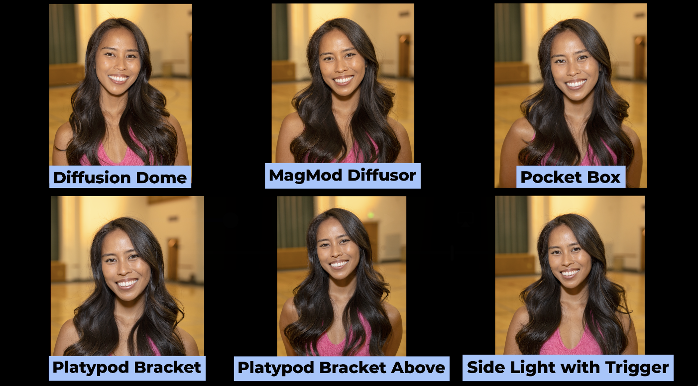 Let’s look at these right from the beginning. There’s the Diffusion Dome. There’s the MagMod diffuser. There’s a small soft box from Westcott. There’s that bracket. There’s the bracket above in that butterfly light. And then last of all, we’ve got the side light when you take it off and use the trigger. So, just the nice thing about working with this is it just gives me the ability to put this light into a place. It’ll make her face look wonderful. If I go to a longer lens like an 85mm, I mean pretty tight.